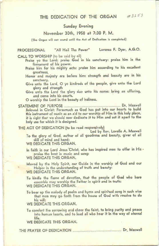 Choir 8 Concert Flote 8 Dulciana II Unda Maris (prep.) 4 Kleingedeckt 4 Violina 2 2/3 Nasat 2 Flote III Scharf (prep.) 8 Vox Humana Tremolo Positiv (prepared for) 8 Rohrflote 4 Nachthorn 2 Principal 1 1/3 Quinte III-IV Cymbal 8 Krummhorn Tremolo Pedal 32 Resultant 16 Diapason 16 Subbass 16 Pommer 16 Lieblich Gedeckt 8 Octavbass 8 Pommer 4 Choralbass 4 Kliengedeckt 2 Octav IV Mixture 16 Trumpet 8 Tuba 4 Oboe Clarion |