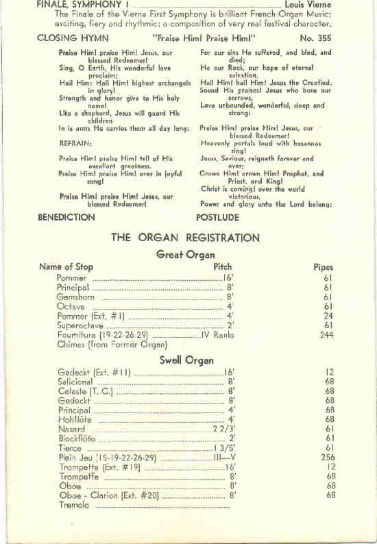 | Great 16 Pommer 8 Principal 8 Gemshorn 4 Octave 4 Pommer 2 Superoctave IV Fourniture Chimes Swell 16 Gedeckt 8 Gedeckt 8 Salicional 8 Celeste (TC) 4 Principal 4 Hohlflote 2 2/3 Nasard 2 Blockflote 1 3/5 Tierce III-V Plein Jeu 16 Trompette 8 Trompette 8 Oboe 4 Oboe-Clarion Tremolo Solo 8 Bombarde 8 Clarinet 8 English Horn Tremolo |