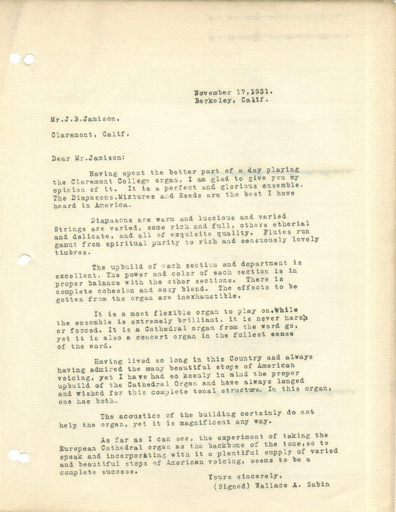 College, Claremont, CA. The auditorium and the organ were the gifts of